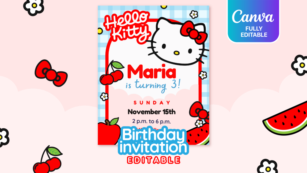 Hello Kitty Theme Invitation Card | Children birthday party invitation canva template